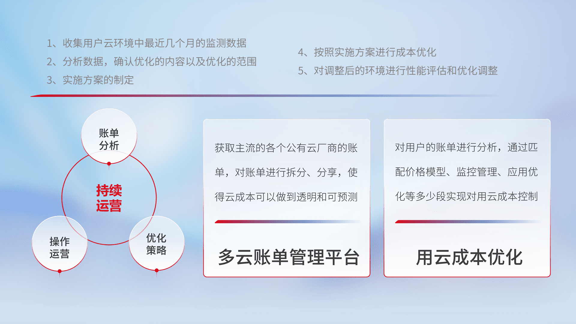 通过多云纳管,,,以统一的资源数据模型把客户的云资源进行抽象和封装,,进而实现对多云资源的统一操作,,,保障云资源管理的可靠性、、稳定性与可用性。。。。量身定制化运维内容,,,配置、、开发运维、、补丁管理、、、备份、、监控、、、认证和访问管理、、、、审计和日常巡检等,,,,保障在用云过程中的可靠度,,,,稳定度以及高可用率。。。